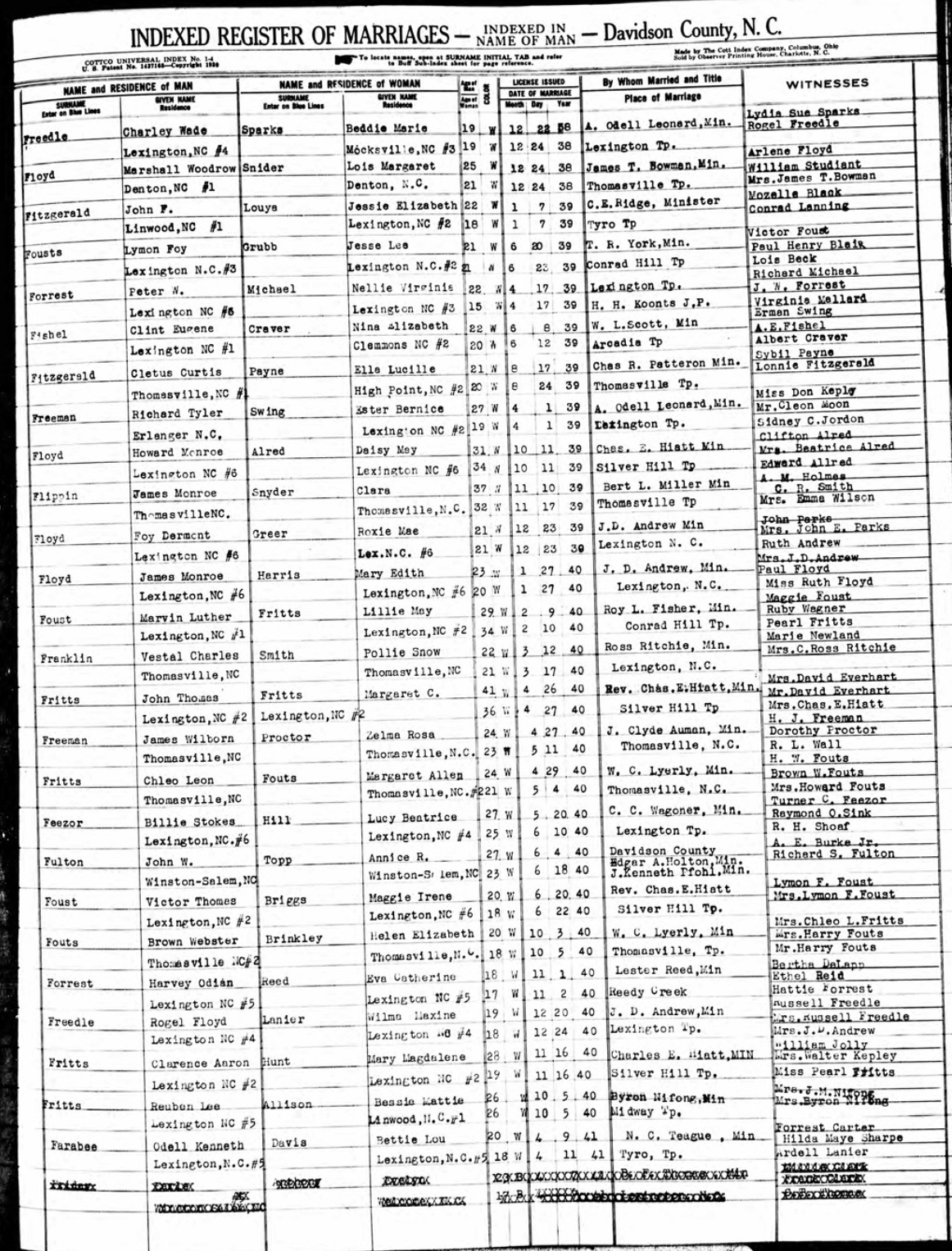 a.viii.a. John Thomas is married aged of 41 years old the saturday 27 april 1940 in Davidson County, North Carolina, USA with Margaret Cornelia Fritts aged of 36 years old, daughter of John Henderson Fritts and Ida Catherine Tysinger. She was born the wednesday 13 may 1903. Margaret Cornelia is deceased the tuesday 27 april 1993 aged of 89 years old. She was buried in Mount Tabor United Church of Christ Cemetery Davidson County, North Carolina, USA.